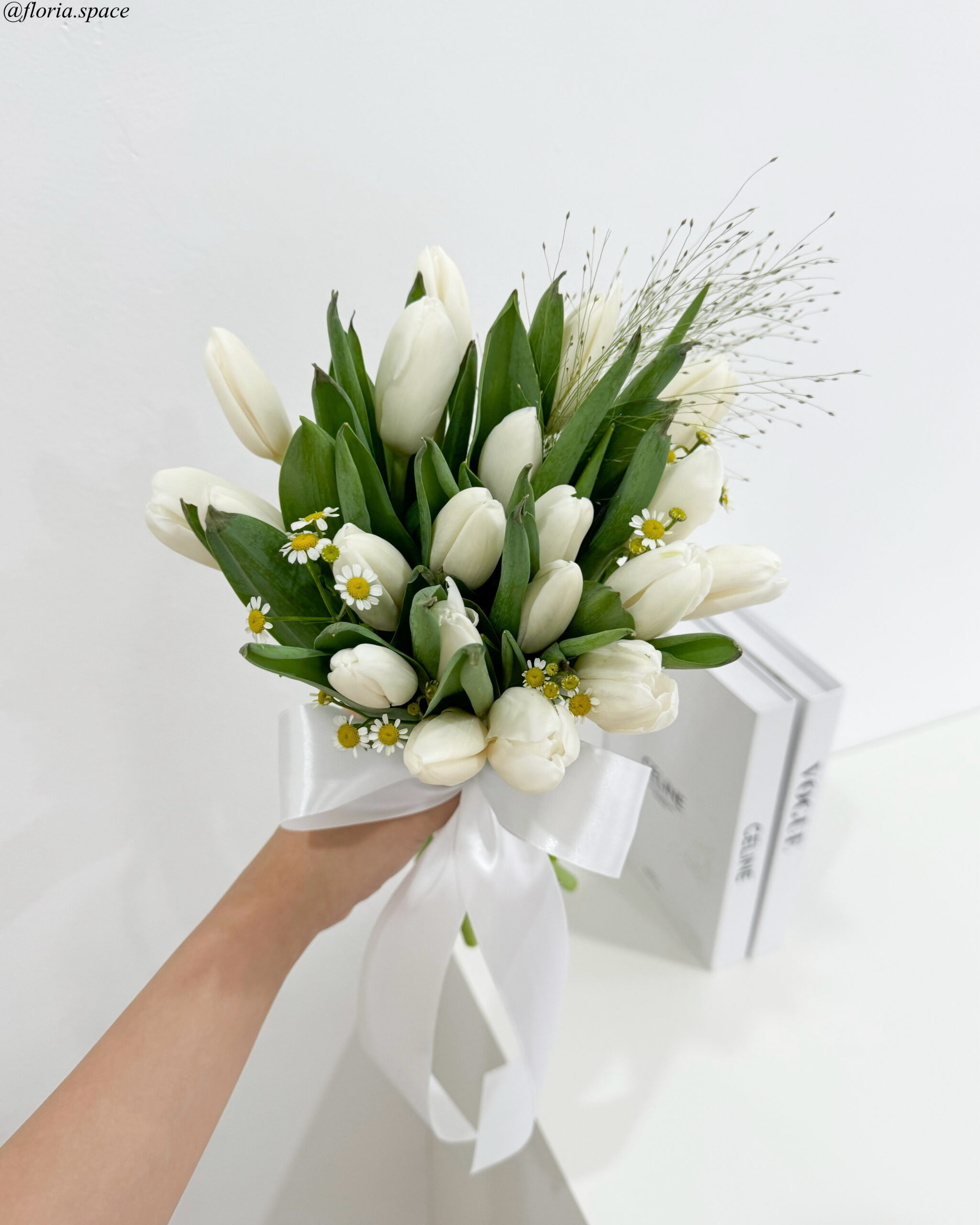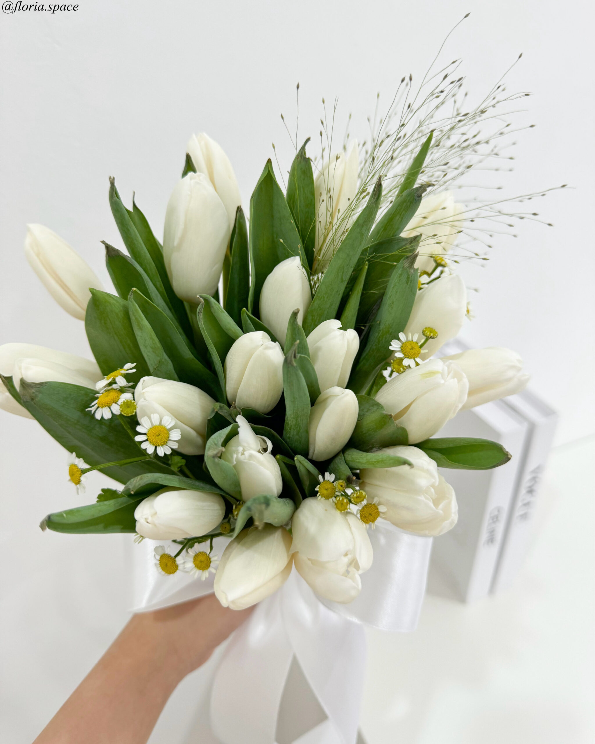 – 18-20 Stalks Fresh Imported White Tulips, Chamomile, Panicum Fountain Leaves (Total- 18-20 Stalks)